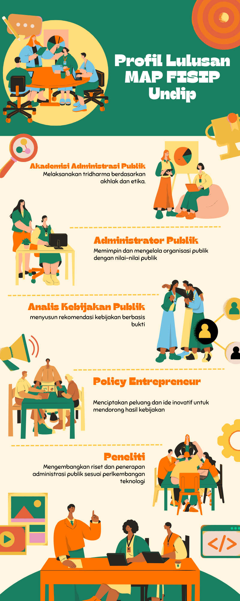 The Master of Public Administration (MAP) program at FISIP Undip produces graduates with five main competency profiles. As Public Administration Academics, graduates are capable of implementing the three pillars of higher education based on morals and ethics. The Public Administrator profile equips them with the ability to lead and manage public organizations with public values. As Public Policy Analysts, graduates are skilled in formulating evidence-based policy recommendations. The Policy Entrepreneur spirit drives graduates to create opportunities and innovative ideas to enhance policy outcomes. Meanwhile, as Researchers, graduates develop research and applications in public administration that are adaptive to technological advancements.